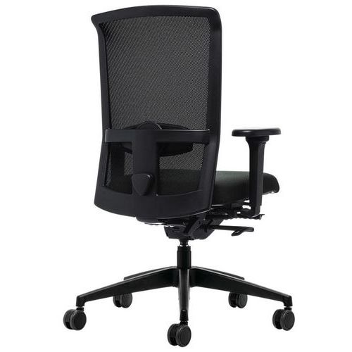 Krzesło biurowe z wysokim, wyściełanym oparciem, które można zablokować w pozycji przedniej i tylnej. Mechanizm synchroniczny z automatyczną regulacją napięcia w zależności od wagi użytkownika. Podparcie lędźwiowe z regulacją wysokości. Podłokietniki regulowane 4D. Płynna regulacja wysokości siedziska w zakresie od 420 do 565 mm.