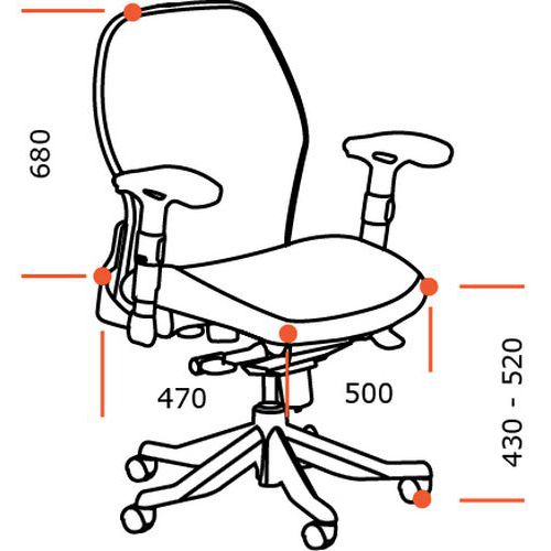 Krzesła biurowe wyposażone w anatomicznie wyprofilowane siedzisko i wysokie siatkowe oparcie. Mechanizm synchroniczny można zablokować w dowolnie wybranej pozycji. Możliwość ustawienia siły przeciwwagi oparcia, wysokości siedziska i wysokości podłokietników. Krzesło jest wyposażone w uniwersalne kółka do podłóg twardych i dywanów. Możliwość dokupienia regulowanego zagłówka.