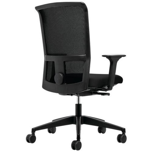Obrotowe krzesło biurowe z wysokim, wyściełanym oparciem, które można zablokować w pozycji przedniej i tylnej. Mechanizm synchroniczny i podparcie lędźwiowe z regulacją wysokości. Podłokietniki regulowane 4D w kształcie litery T. Twarde kółka z hamulcami o średnicy 65 mm. Regulowana wysokość siedziska od 415 do 520 mm.