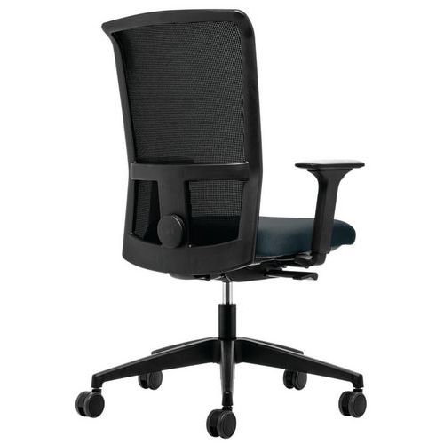 Obrotowe krzesło biurowe z wysokim, wyściełanym oparciem, które można zablokować w pozycji przedniej i tylnej. Mechanizm synchroniczny i podparcie lędźwiowe z regulacją wysokości. Podłokietniki regulowane 4D w kształcie litery T. Twarde kółka z hamulcami o średnicy 65 mm. Regulowana wysokość siedziska od 415 do 520 mm.