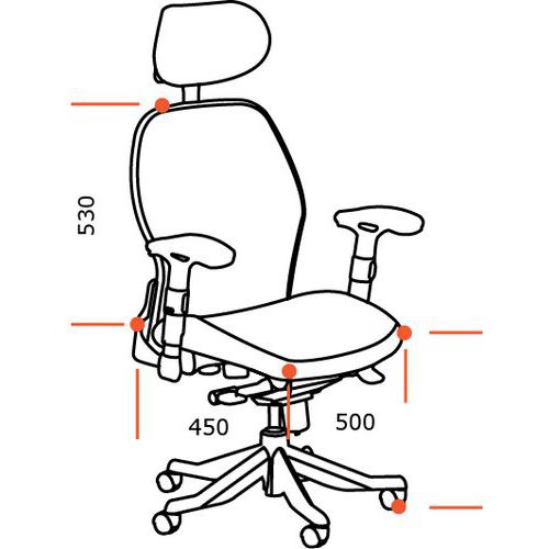 Ekskluzywne krzesło biurowe z siedziskiem i wyraźnie wypukłym oparciem z wysokiej jakości litej pianki PUR, charakteryzującej się pamięcią wysokości i dużą stałością kształtów. Możliwość ustawienia wysokości oparcia za pomocą przycisku sterującego. Krzesło wyposażono w zagłówek dla zapewnienia większego komfortu, chromowany podnośnik pneumatyczny i stelaż pięcioramienny z polerowanego aluminium z kółkami do podłóg miękkich. Nośność krzesła obrotowego wynosi 140 kg.