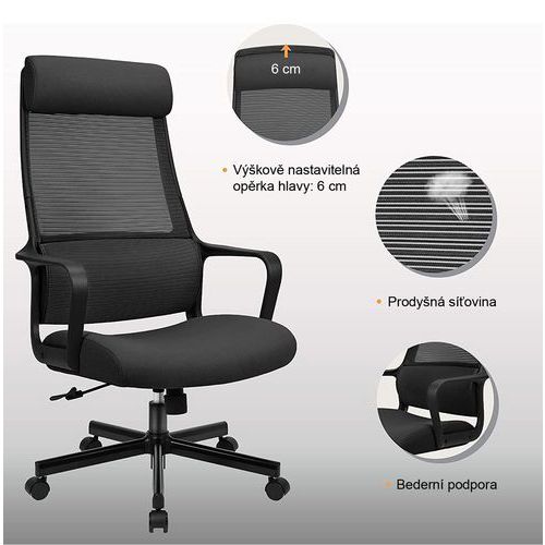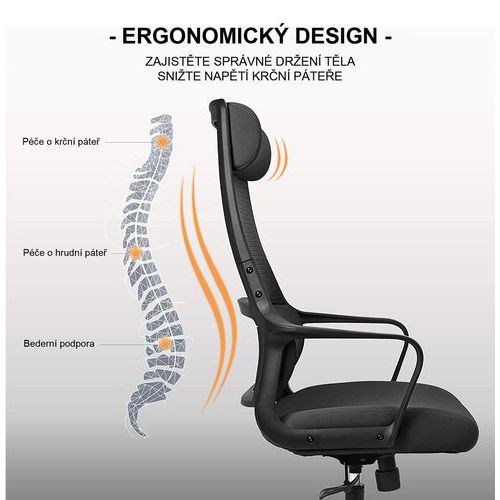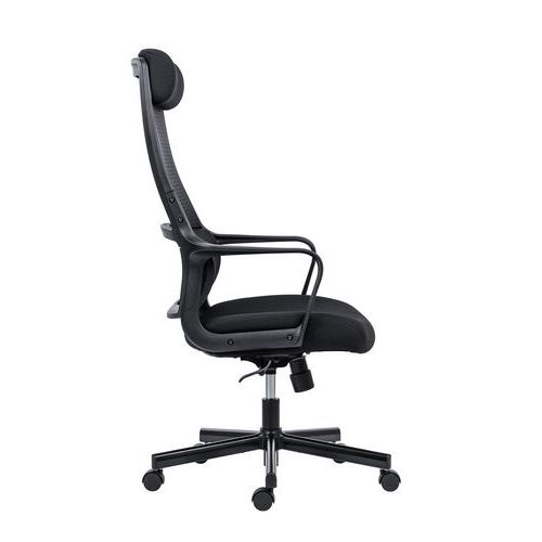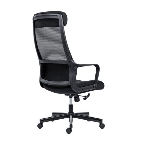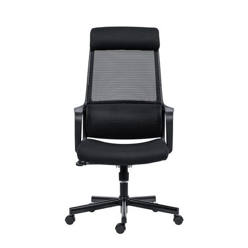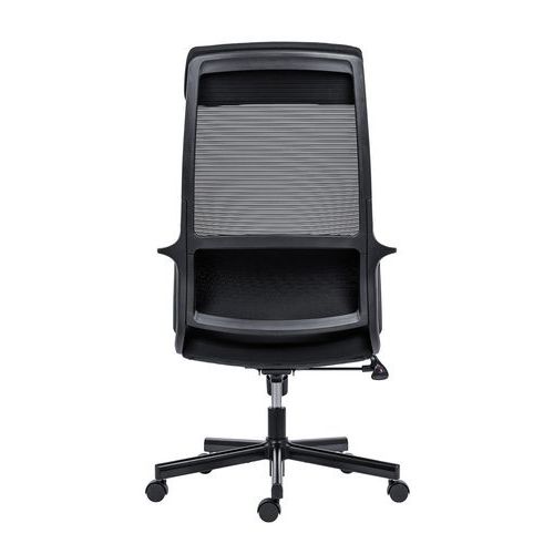 - Krzesło biurowe Faro z wysokim przewiewnym oparciem obitym czarną siatką.