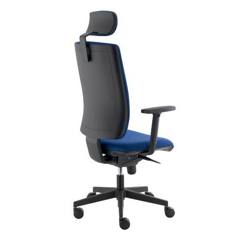 Krzesło biurowe w dwóch wariantach kolorystycznych, z mechanizmem synchronicznym, regulowanym oparciem i podłokietnikami umożliwiającymi regulację wysokości oraz odległości od siedziska. Nośność 150 kg.