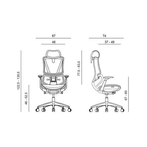 - Podłokietniki o regulowanej wysokości 4D z miękką w dotyku powierzchnią regulowaną wzdłużnie, kątowo i wszerz, odchylane wraz z oparciem.