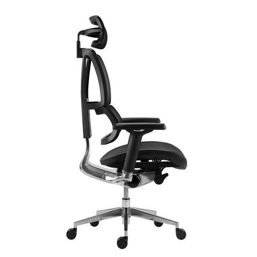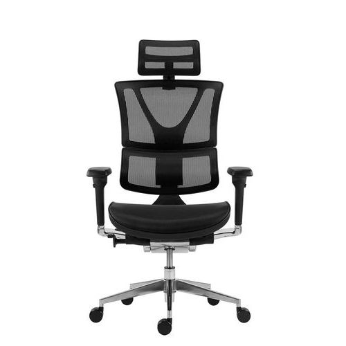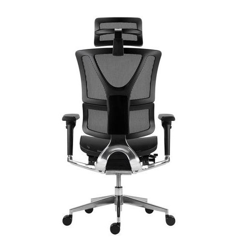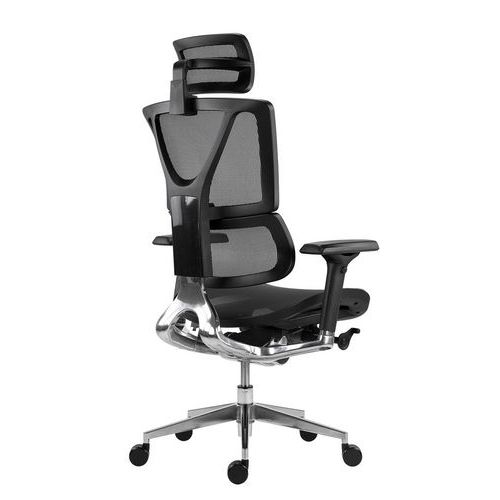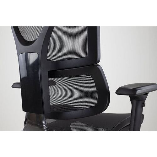 - Krzesło biurowe Korina z siatką na siedzisku, oparciu i zagłówku.