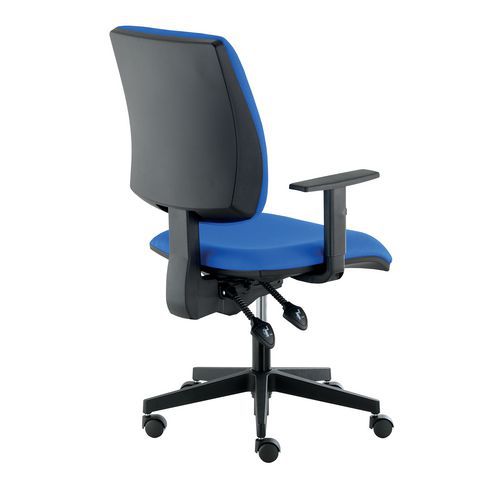 Tapicerowane fotele z mechanizmem asynchronicznym umożliwiającym płynną regulację kąta odchylenia oparcia i siedziska oraz zablokowania ich w dowolnym położeniu. Wysokość oparcia krzesła biurowego można regulować. Wysokość siedziska można zmieniać za pomocą podnośnika pneumatycznego. Krzesło jest wyposażone w nylonowy, pięcioramienny stelaż z kółkami przeznaczonymi do podłóg miękkich.