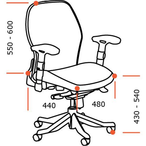 Krzesła mają regulowane ergonomiczne oparcie, pokryte przewiewną siateczką i zintegrowanym podparciem kręgów lędźwiowych.