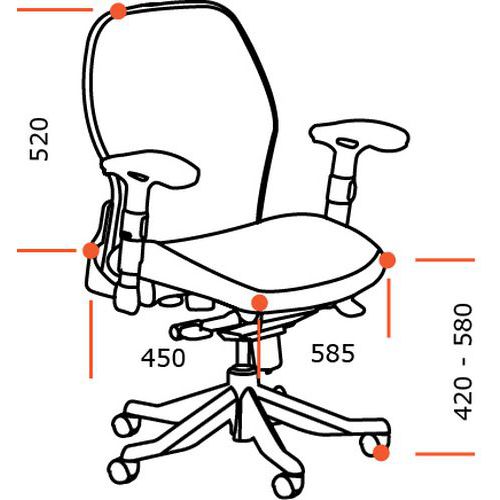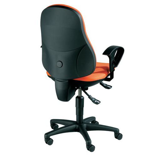 Tapicerowane krzesło biurowe z profilowanym oparciem i zintegrowaną podpórką lędźwiowego odcinka kręgosłupa, z możliwością regulacji wysokości za pomocą mechanizmu zapadkowego. Zaletą jest wygodne, ergonomicznie wyprofilowane siedzisko i synchroniczny mechanizm umożliwiający płynne ustawianie wzajemnego położenia siedziska i oparcia, włącznie z wysokością siedziska. Możliwość ustawienia siły reakcji oparcia w zależności od masy ciała osoby siedzącej. Krzesła obrotowe są wyposażone w bezpieczne, podwójne kółka do podłoży miękkich, hamowane w zależności od obciążenia. Dostępne w trzech wariantach kolorystycznych. Nośność tego krzesła obrotowego wynosi 120 kg.