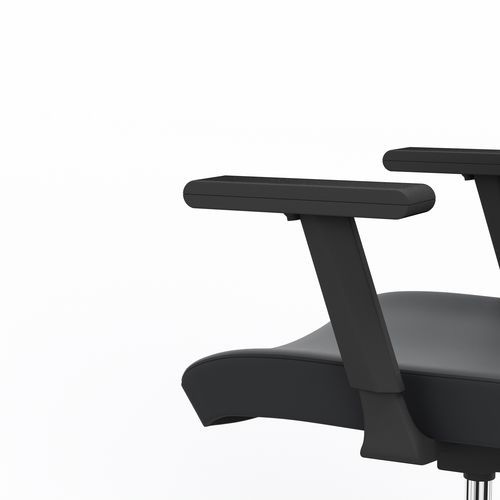 Plastikowe podłokietniki z regulacją wysokości i czarny pięcioramienny plastikowy krzyżak.