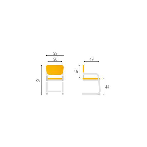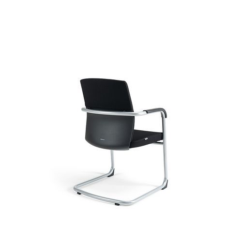 - Konferencyjne krzesło materiałowe z metalową konstrukcją płozową i wbudowanymi podłokietnikami.