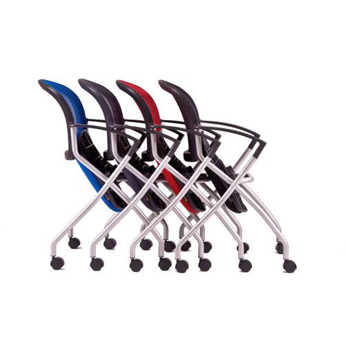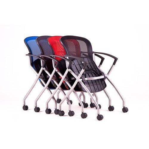 - Krzesło konferencyjne z oparciem z siatki samonośnej i wbudowanymi podłokietnikami.