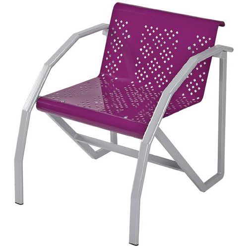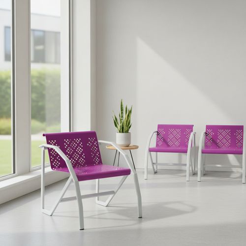Krzesło metalowe przeznaczone m.in. do poczekalni. Metalowa konstrukcja, z powierzchnią wykończoną lakierem epoksydowym w kolorze aluminium. Zakrzywiona konstrukcja po bokach pełni funkcję podłokietników. Metalowe siedziska z blachy perforowanej w różnych kolorach.