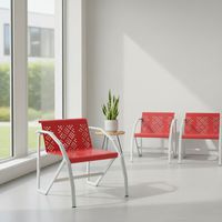Krzesło metalowe przeznaczone m.in. do poczekalni. Metalowa konstrukcja, z powierzchnią wykończoną lakierem epoksydowym w kolorze aluminium. Zakrzywiona konstrukcja po bokach pełni funkcję podłokietników. Metalowe siedziska z blachy perforowanej w różnych kolorach. Gwarancja producenta dla klienta : 10 lat