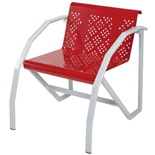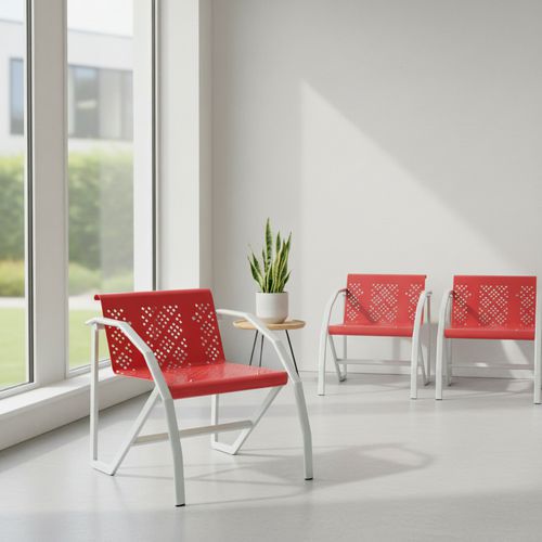 Krzesło metalowe przeznaczone m.in. do poczekalni. Metalowa konstrukcja, z powierzchnią wykończoną lakierem epoksydowym w kolorze aluminium. Zakrzywiona konstrukcja po bokach pełni funkcję podłokietników. Metalowe siedziska z blachy perforowanej w różnych kolorach.