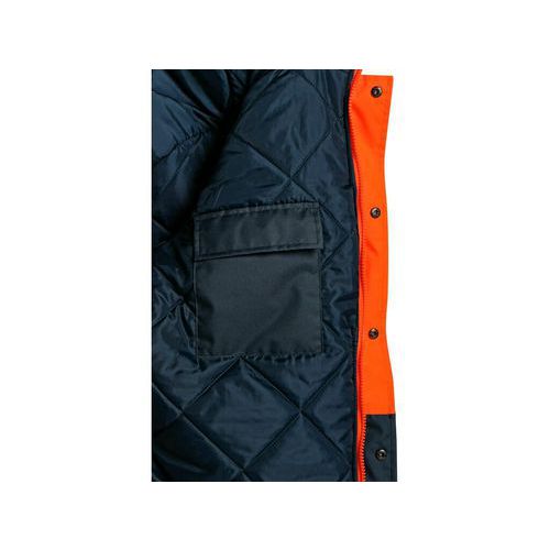 Kurtka o wysokiej widoczności, ocieplana, wiatroszczelna i wodoodporna, kaptur chowany w kołnierzu, paski odblaskowe, rękawy i dół wykończone ciemnoniebieskim materiałem, 4 kieszenie zewnętrzne i 1 kieszeń wewnętrzna, kieszeń zewnętrzna na telefon komórkowy, możliwość ściągnięcia u dołu kurtki. Zastosowanie zalecane: budownictwo, drogowcy, kierowcy, logistyka, konserwacja, wywóz śmieci, pracownicy magazynów, służby ratownicze, prace zimowe i w wilgotnym środowisku. Sezon: Zima Materiał wierzchni: 100% poliester Oxford Izolacja: 100% poliester, 160 g/m2 Akcesoria odblaskowe: Tak Rozmiar: M-3XL