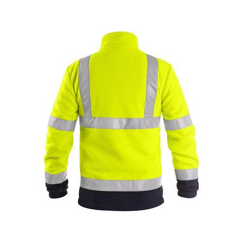 Męska kurtka polarowa o wysokiej widoczności z odblaskowymi paskami. Elastyczne rękawy, kieszenie boczne i na piersi zapinane na zamek, ściągacz u dołu, podszewka z siateczki.