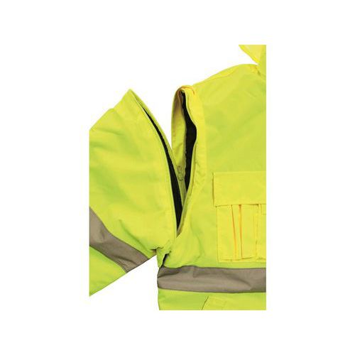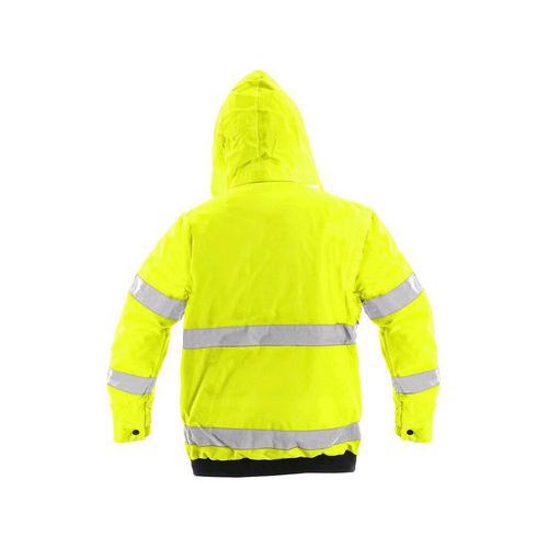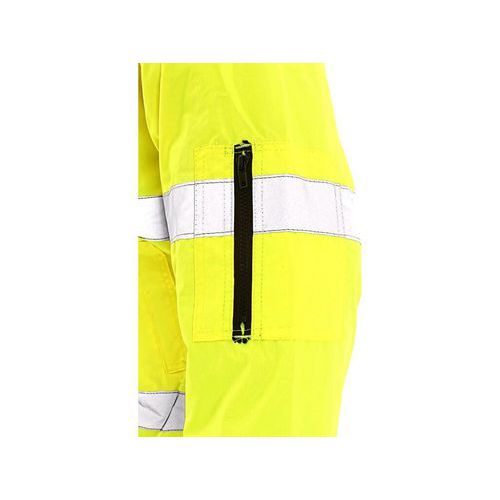 - Kurtka ostrzegawcza, ocieplana, 2 w 1, do pasa, wodoodporna, odpinane rękawy, kaptur w kołnierzu, elastyczny dół, klejone szwy.