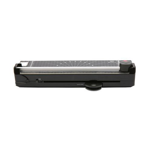 - Stanowi praktyczne połączenie laminatora z gilotyną tarczową, z przyrządem do zaokrąglania rogów