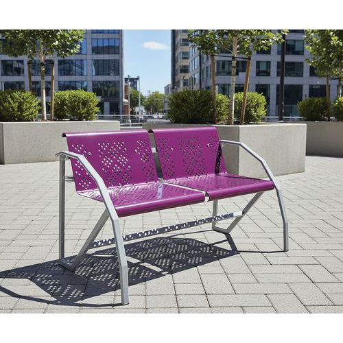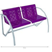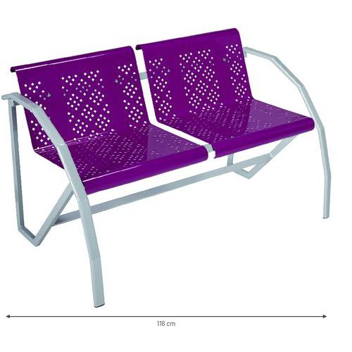 Ławy dwuosobowe przeznaczone m.in. do poczekalni. Metalowa konstrukcja, z powierzchnią wykończoną lakierem epoksydowym w kolorze aluminium. Zakrzywiona konstrukcja po bokach pełni funkcję podłokietników. Metalowe siedziska z blachy perforowanej w różnych kolorach. Gwarancja producenta dla klienta : 10 lat