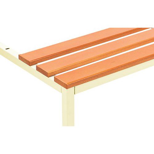 Ławki z konstrukcją stalową i siedziskiem drewnianym są umieszczane pod metalowe szafy do szatni. materiał: drewno / metal wymiary wys. x sz. x gł.: 35 x 117 x 80 cm szerokość siedziska: 30 cm kolor: szary RAL 7035, beżowy RAL 1015