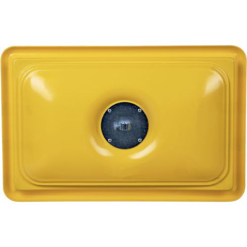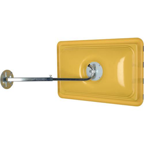 - Przemysłowe lustro kontrolne z żółto-czarnymi paskami, które sygnalizują niebezpieczne obszary.
