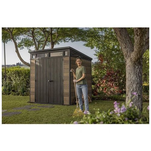 Plastikowy magazynek ogrodowy Horizontal w kolorze jasnobrązowym nie wymaga konserwacji i jest wykonany z unikalnego materiału Decocoat, stylizowanego na drewno o nowoczesnym wyglądzie.