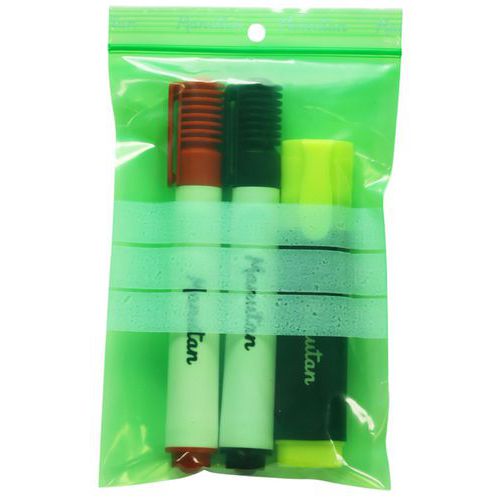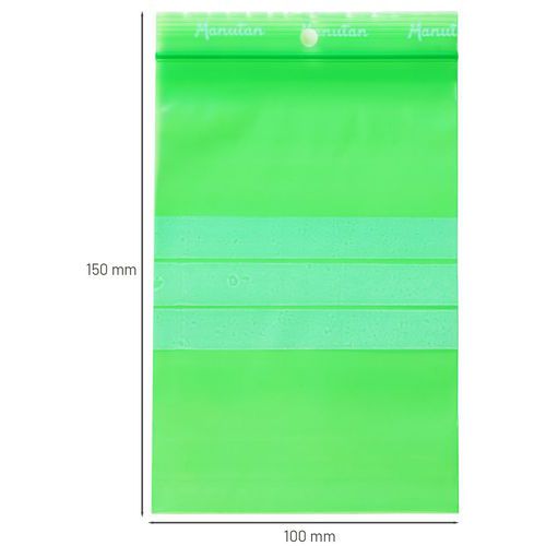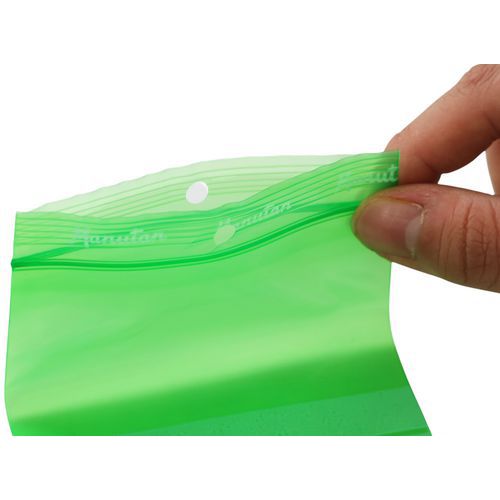 Zielone torby zapinane na zamek. Zawierają otwór do zawieszenia. Dostarczane w opakowaniach po 100 sztuk.