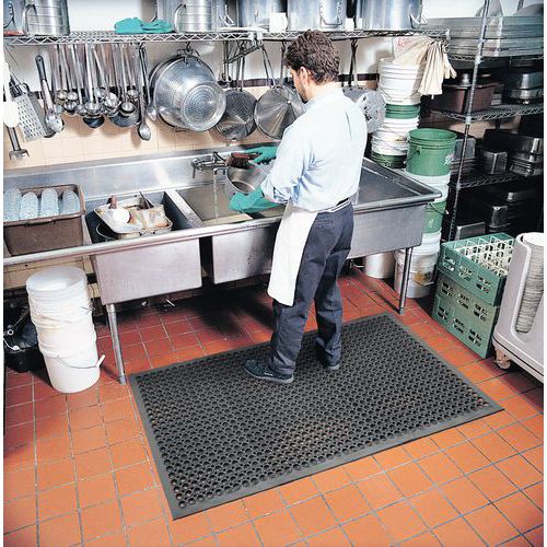Wielozadaniowa ergonomiczna krata gumowa Sanitop. Łatwa do podnoszenia dla doskonałej konserwacji podłogi. Formowana mata o ściętych krawędziach, kompatybilna z PRM. Materiał antyzmęczeniowy i antypoślizgowy.