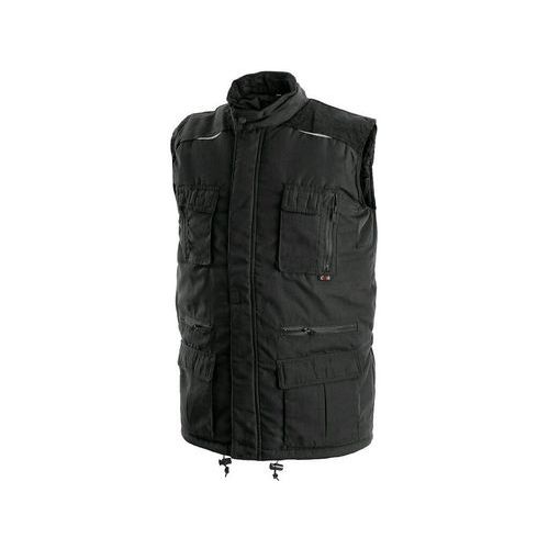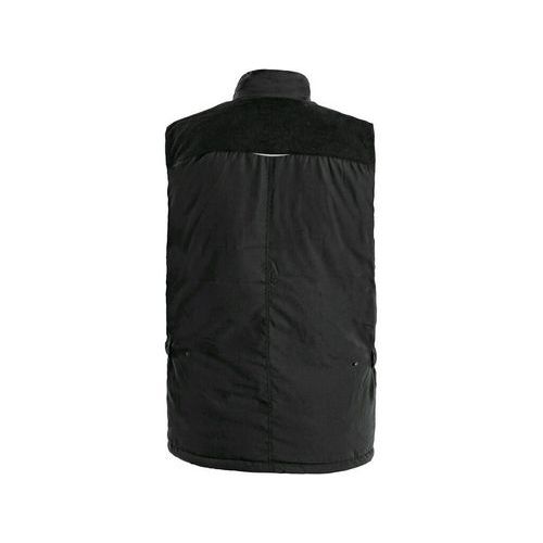 Czarna ocieplana kamizelka robocza z kołnierzem, przeszycie sztruksem. Kamizelka ma 14 kieszeni, w tym trzy wewnętrzne. Możliwość ściągnięcia kamizelki w pasie. rozmiar: M, L, XL, XXL, XXXL wersja: męska materiał: 65% poliester, 35% bawełna, wypełnienie i podszewka 100% poliester kolor: czarny