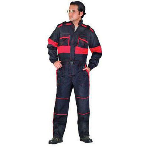 Czarny męski kombinezon roboczy z czerwonymi dodatkami. Kieszenie środkowe na piersi i duże przednie kieszenie zmieszczą telefon, miarę i inne drobne przedmioty niezbędne do pracy. Komfort noszenia zapewnia elastyczna część lędźwiowa, możliwość spięcia pasa klamrą i zakończenia rękawów i nogawek do mankietu. Podwójny wzmocniony obszar kolan ułatwia częste klękanie. Kryte zapięcia na zamek błyskawiczny oraz zapięcie przy szyi. EN ISO 13688: Ta międzynarodowa norma określa ogólne wymagania dotyczące wykonania odzieży ochronnej pod względem ergonomii, stanu, oznaczenia rozmiarów, trwałości, kompatybilności oraz informacji dostarczanych przez producenta.