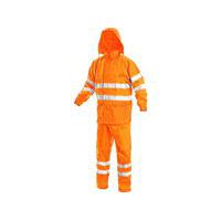 Nieprzemakalne spodnie odblaskowe ostrzegawcze i nieprzemakalna odblaskowa kurtka w jednym zestawie. Wysoka widoczność za dnia i w nocy. Spodnie z gumą w pasie. Kaptur w kołnierzu. Podklejane szwy. Pasy odblaskowe w pasie, na rękawach i nogawkach.