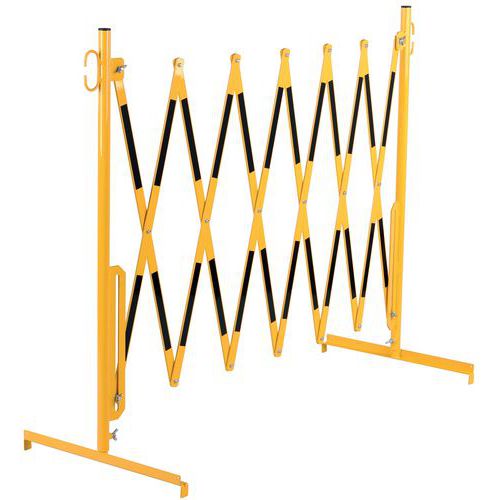 - Składane stalowe barierki z nóżkami po 2 stronach do okresowego zamykania niebezpiecznych przestrzeni.