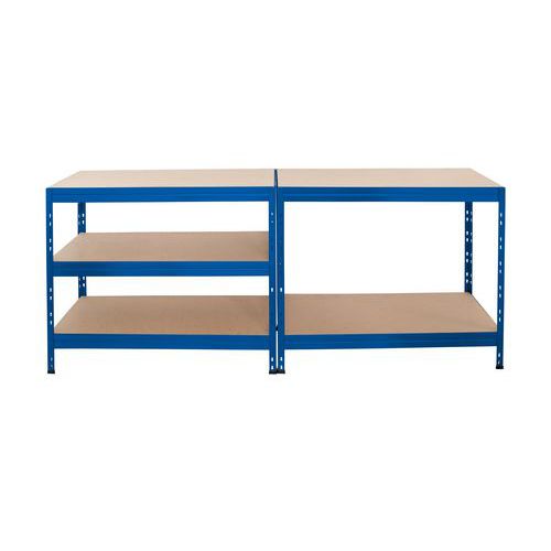 Bezśrubowe regały półkowe Manutan Expert Rapid 3 przeznaczone do biur, warsztatów i magazynów. Półki wykonane z wysokiej jakości płyty pilśniowej wysokiej gęstości (HDF) można ustawiać co 40 mm. Plastikowe stopki ochronne. Konstrukcja z blachy stalowej o gr. 1–1,5 mm. Powierzchnia ocynkowana lub pokryta lakierem proszkowym. Regały można łączyć w zestawy za pomocą elementów łączących. Słupki składają się z dwóch części, dzięki czemu regał można przebudować na stół warsztatowy.