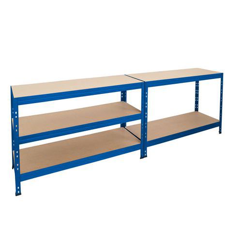 Bezśrubowe regały półkowe Manutan Expert Rapid 3 przeznaczone do biur, warsztatów i magazynów. Półki wykonane z wysokiej jakości płyty pilśniowej wysokiej gęstości (HDF) można ustawiać co 40 mm. Plastikowe stopki ochronne. Konstrukcja z blachy stalowej o gr. 1–1,5 mm. Powierzchnia ocynkowana lub pokryta lakierem proszkowym. Regały można łączyć w zestawy za pomocą elementów łączących. Słupki składają się z dwóch części, dzięki czemu regał można przebudować na stół warsztatowy.