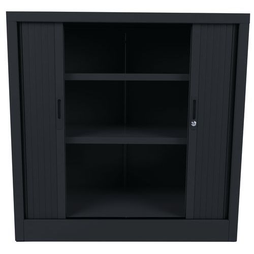 Niska metalowa szafka przeznaczona do odkładania segregatorów, prospektów i dokumentów biurowych. Ciche drzwi roletowe z magnetycznym zamykaniem. Wyposażona w dwie półki przestawne. Nośność maksymalna na półkę wynosi 60 kg. Możliwość zamknięcia szafki na klucz.