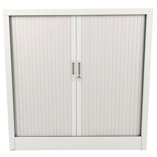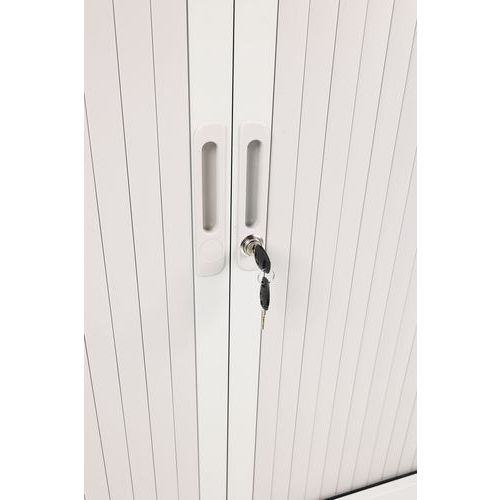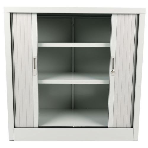 Niska metalowa szafka przeznaczona do odkładania segregatorów, prospektów i dokumentów biurowych. Ciche drzwi roletowe z magnetycznym zamykaniem. Wyposażona w dwie półki przestawne. Nośność maksymalna na półkę wynosi 60 kg. Możliwość zamknięcia szafki na klucz.