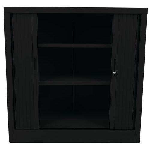 Niska szafka aktowa przeznaczona do odkładania segregatorów, prospektów i dokumentów biurowych. Ciche drzwi roletowe z magnetycznym zamykaniem. Wyposażona w dwie półki przestawne. Nośność maksymalna na półkę wynosi 60 kg. Możliwość zamknięcia szafki na klucz.