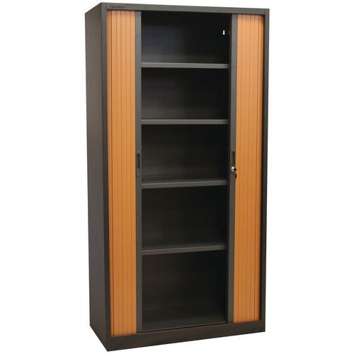 Metalowa szafa aktowa z roletą Manutan Expert, 4 półki, 195 x 100 x 45 cm, antracyt/czereśnia