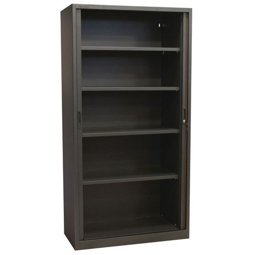 Szafa z czterema półkami przestawnymi i plastikowymi roletami, które można w całości wsunąć do ścian bocznych.