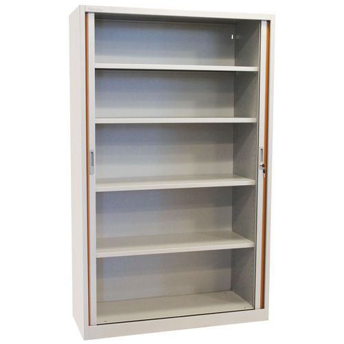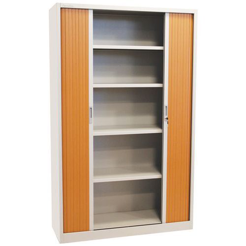 Szafa z czterema półkami przestawnymi i plastikowymi roletami, które można w całości wsunąć do ścian bocznych.