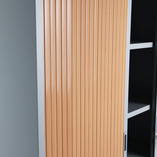 Szafa z czterema półkami przestawnymi i plastikowymi roletami, które można w całości wsunąć do ścian bocznych.