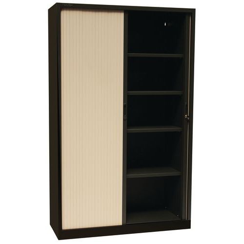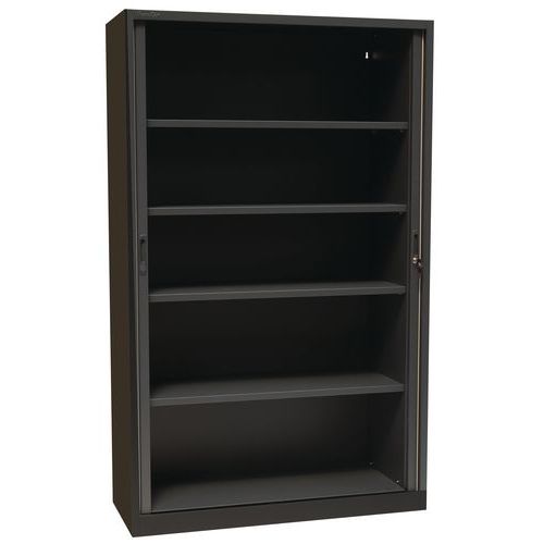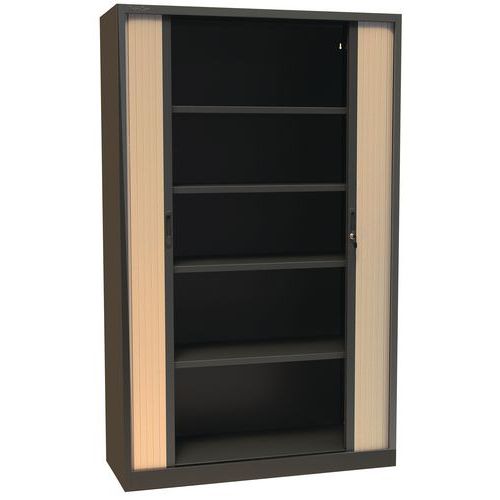 Szafa z czterema półkami przestawnymi i plastikowymi roletami, które można w całości wsunąć do ścian bocznych.
