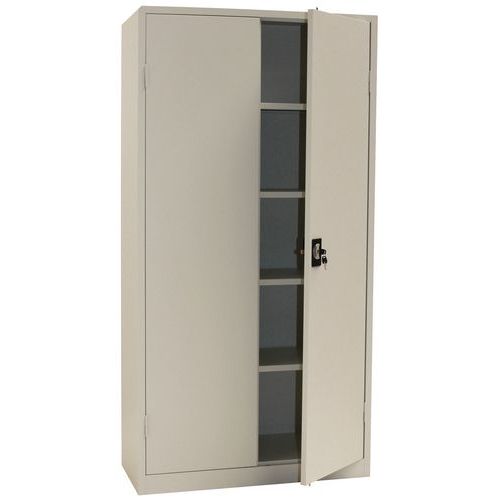 Wysoka szafa aktowa Manutan Expert 2000 zapewnia optymalną przestrzeń do przechowywania segregatorów, akt i innych dokumentów biurowych. Podwójne drzwi wyposażone w amortyzator z zawiasami zewnętrznymi, umożliwiają rozwarcie do 180°. Odpowiednią przestrzeń na dokumenty zapewniają cztery półki przestawne. Możliwość umieszczenia wysuwanej listwy na segregatory zawieszane (brak w zestawie). Szafka zamykana na cylindryczny zamek trzypunktowy. Zamek jest wbudowany w rączkę. W celu zapewnienia wyższego bezpieczeństwa i stabilności istnieje możliwość przymocowania do ściany za pomocą przygotowanych otworów z tyłu szafy.
