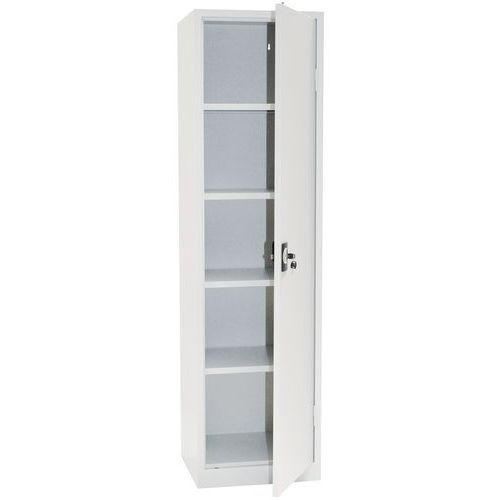 Metalowe wysokie szafy Manutan Expert przeznaczone do biur, do przechowywania segregatorów i dokumentów. Drzwi z zawiasami zewnętrznymi, obrót o 180°, wyposażone w amortyzator. Posiadają 4 półki umożliwiające regulację wysokości i przejrzystą organizację dokumentów. Możliwość umieszczenia wysuwanej listwy na segregatory zawieszane (brak w zestawie). Zamykanie szafki na zamek trzypunktowy. Zamek jest wbudowany w rączkę. W celu zapewnienia wyższego bezpieczeństwa i stabilności istnieje możliwość przymocowania do ściany za pomocą przygotowanych otworów z tyłu szafy.