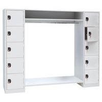 Wielofunkcyjny zestaw szatniowy do odkładania rzeczy osobistych i ubrań, przeznaczony do pomieszczeń wewnętrznych. Tworzy go dziesięć odrębnych boksów po bokach, część środkowa jest wyposażona w dwie półki oraz metalowy pręt o długości 90 cm. Wentylacja boksów za pomocą otworów wentylacyjnych na tylnej stronie. Drzwi boksów są zawieszone na zawiasach zewnętrznych i zamykane za pomocą zamka cylindrycznego.