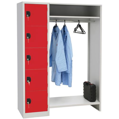 Wielofunkcyjny zestaw szatniowy do odkładania rzeczy osobistych i ubrań, przeznaczony do pomieszczeń wewnętrznych. Jedną część tworzy pięć boksów, część druga jest wyposażona w dwie półki oraz metalowy pręt o długości 45 cm. Wentylacja boksów za pomocą otworów wentylacyjnych na tylnej stronie. Drzwi boksów są zawieszone na zawiasach zewnętrznych i zamykane za pomocą zamka cylindrycznego. Montaż : Do montażu Grubość blachy : 6/10e Gwarancja producenta dla klienta : 10 lat