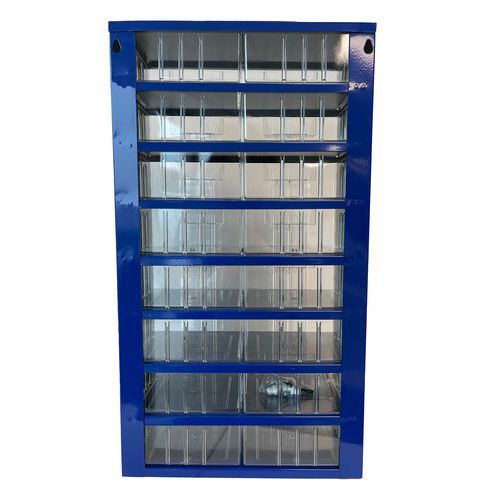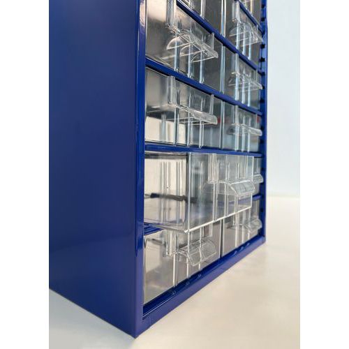 - Metalowy organizer z szufladkami służy do uporządkowanego przechowywania drobnych przedmiotów i części.
