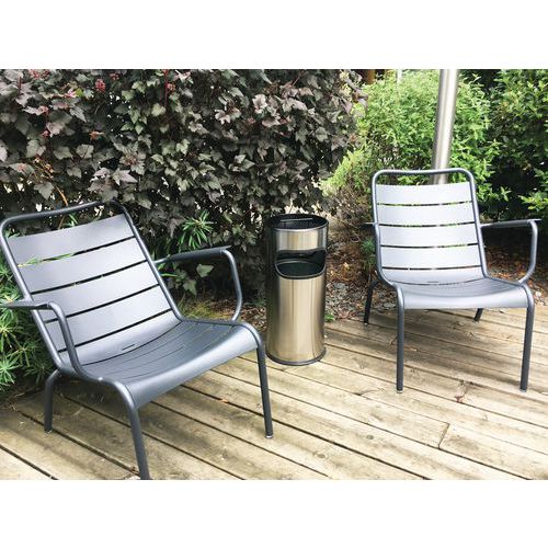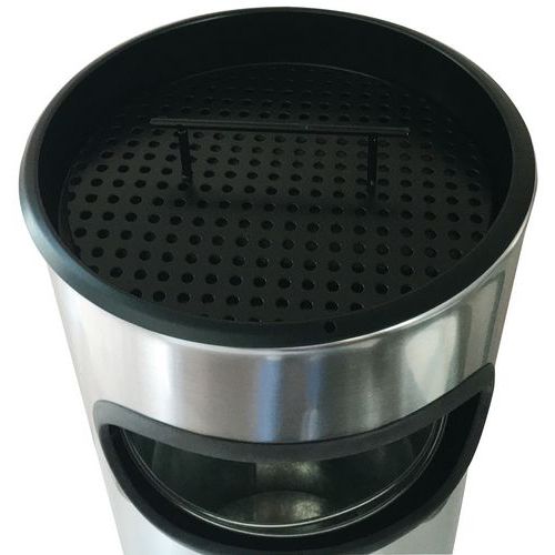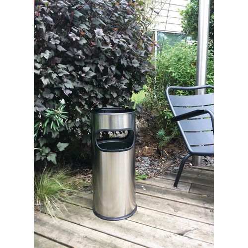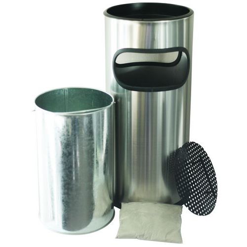 Okrągły kosz ognioodporny na odpadki z popielniczką. Metalowy wkład z uchwytem do łatwego opróżniania popielniczki. Otwór boczny do wrzucania odpadów. Nadaje się do umieszczania w zadaszonych obszarach zewnętrznych.