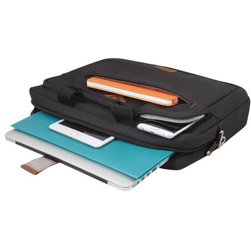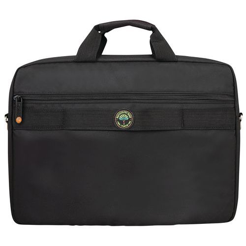 Torby na laptopy z przegrodą na tablety o przekątnej do 10,5 cala. Wyposażone są w przegrodę na różne akcesoria i dokumenty. Wygodne wzmocnione uchwyty, przednie i tylne kieszenie zapinane na zamek. Wykonane z materiału pochodzącego z recyklingu.