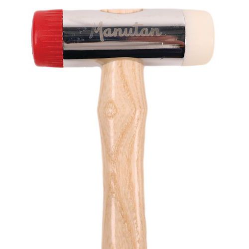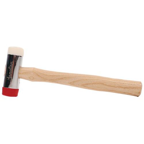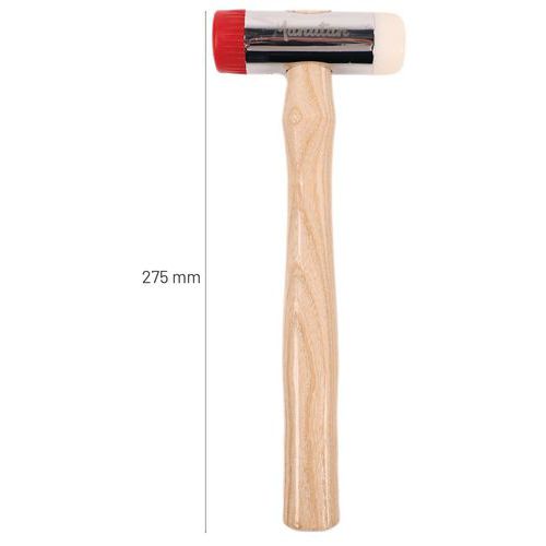Młotek ze stalowym obuchem i wymiennymi końcówkami gumowymi. Drewniany trzonek.